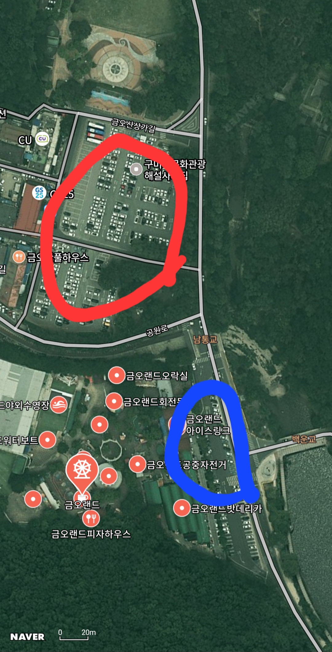 금오랜드 바로 앞에 작은 주차장이 있는데(파란 동그라미)